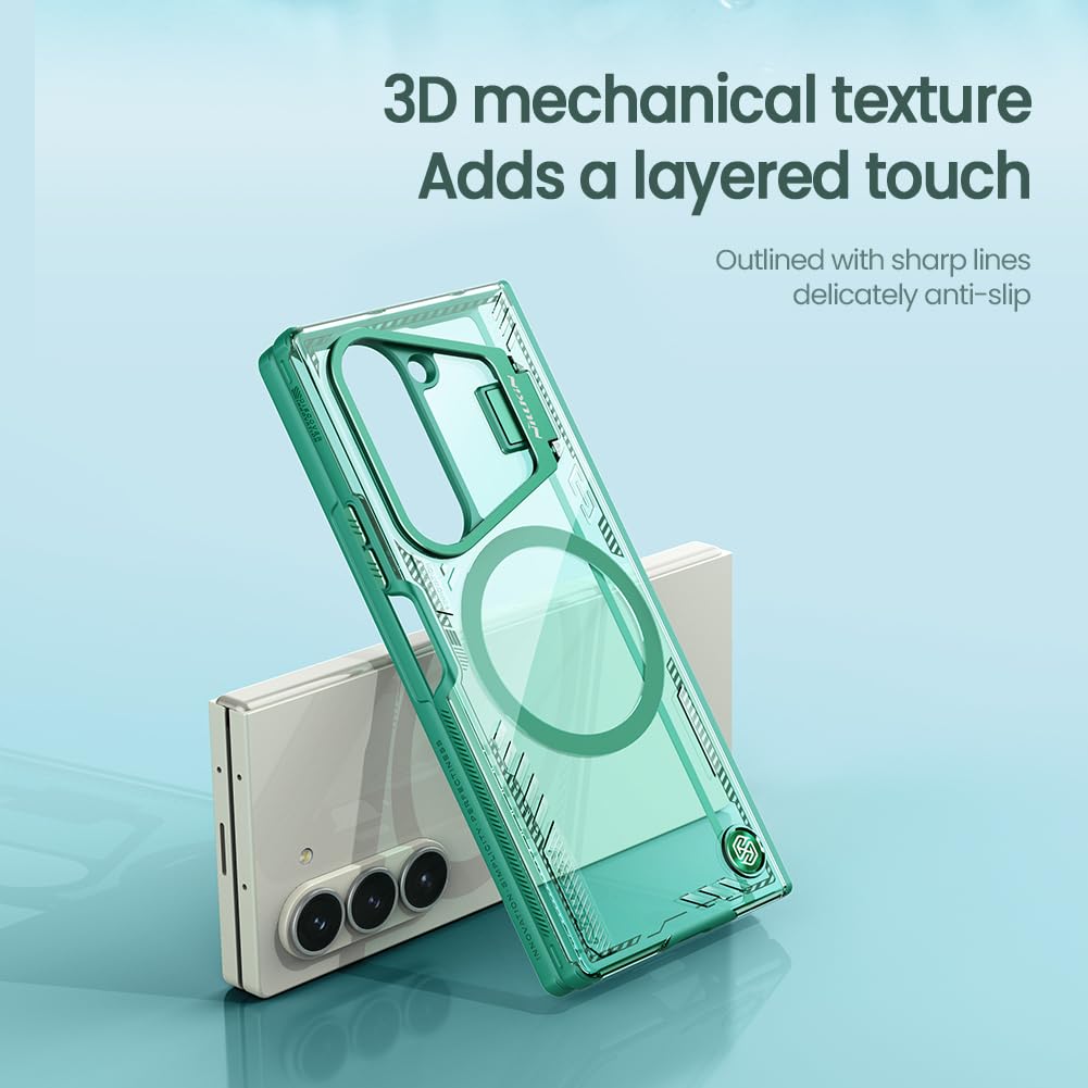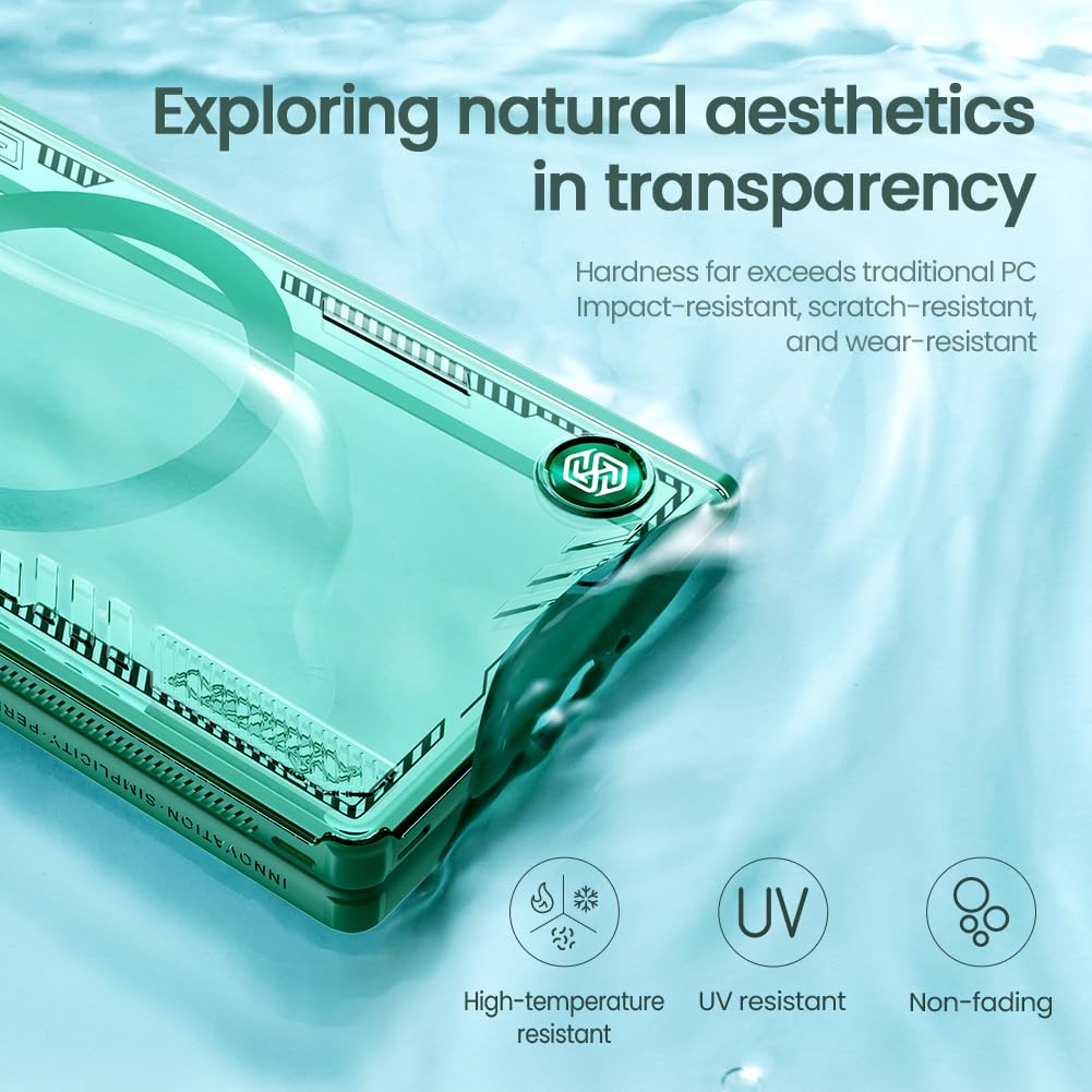 Nillkin Iceblade Fold Magnetic Case: The Iceblade Prop Case is made from eco-friendly bio-based materials derived from corn and sugarcane, reducing carbon emissions and promoting sustainability. It offers excellent corrosion resistance and remains clear and non-yellowing over time, enhancing its aesthetic appeal. The functional aesthetic design features sleek lines that lead a new urban trend. The aerospace aluminum mirror cover stand, with its space capsule design, provides a cutting-edge look while protecting the lens and serving as a phone stand.A built-in powerful magnet makes you enjoy the experience from MagSafe; It is integrated with imported Bayer soft rubber, offering superior protection.